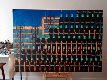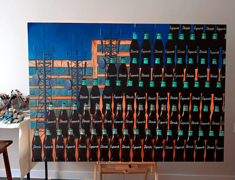 Em Coca-colonização, o alinhamento das garrafas produz um campo visual rigoroso, quase hipnótico. O olhar é convocado a percorrer fileiras que, à primeira vista, oferecem uma escolha binária. A inscrição de palavras que remetem a posições de debate sugere um jogo conhecido, mas o ritmo dos elementos revela outro enigma: nada ali parece sujeito ao dissenso propriamente dito, tudo está preparado para adesão imediata.
