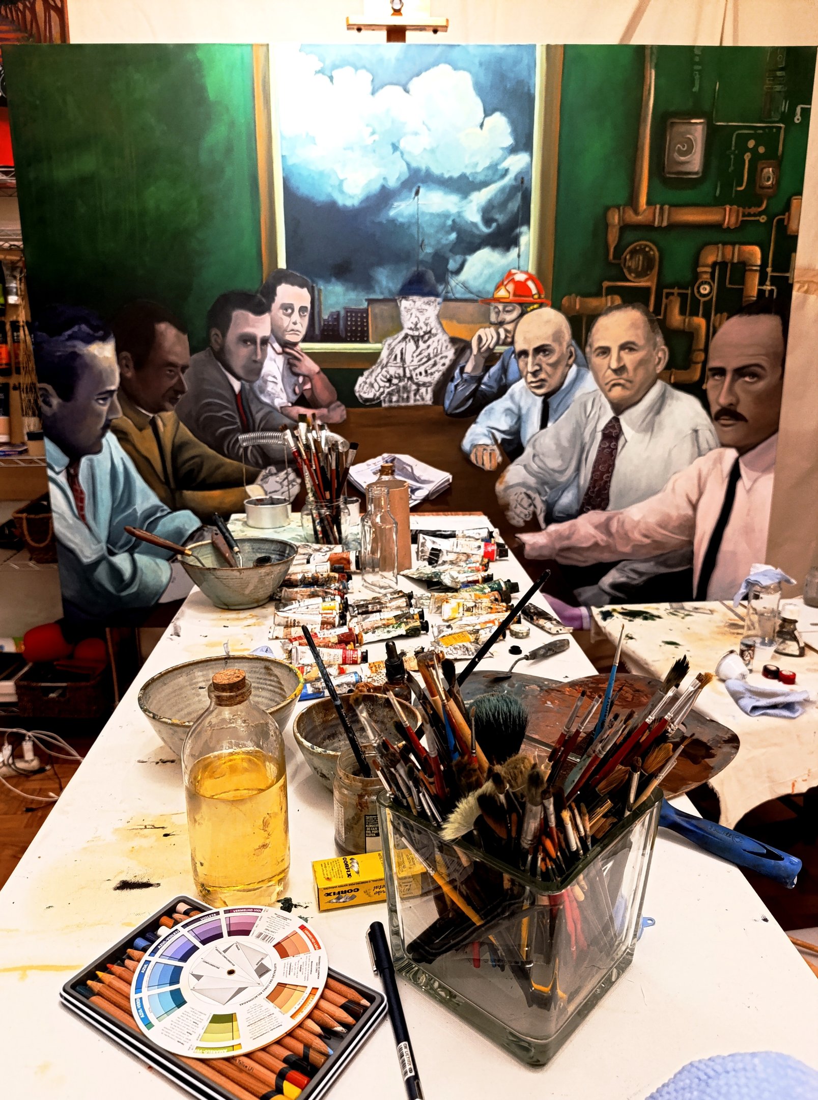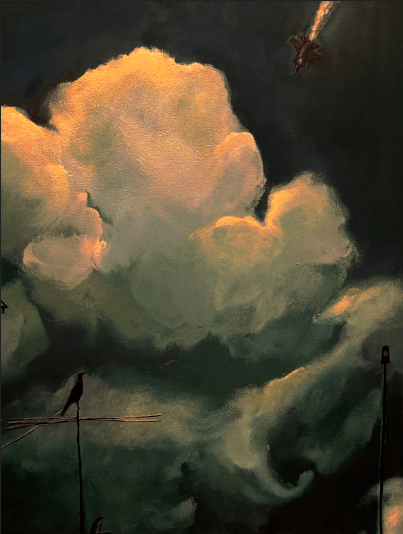 Ao fundo, um edifício atravessado por torres e estruturas de transmissão. Ele não produz mercadorias, produz códigos. É por essa arquitetura que algo se infiltra, age, desgasta. A obra permite que se veja, num só plano, a superfície do espetáculo e o ponto onde ele é fabricado. Não há destruição abrupta, apenas a lenta deterioração que ocorre quando tudo se organiza para parecer estável, mesmo enquanto colapsa por dentro.