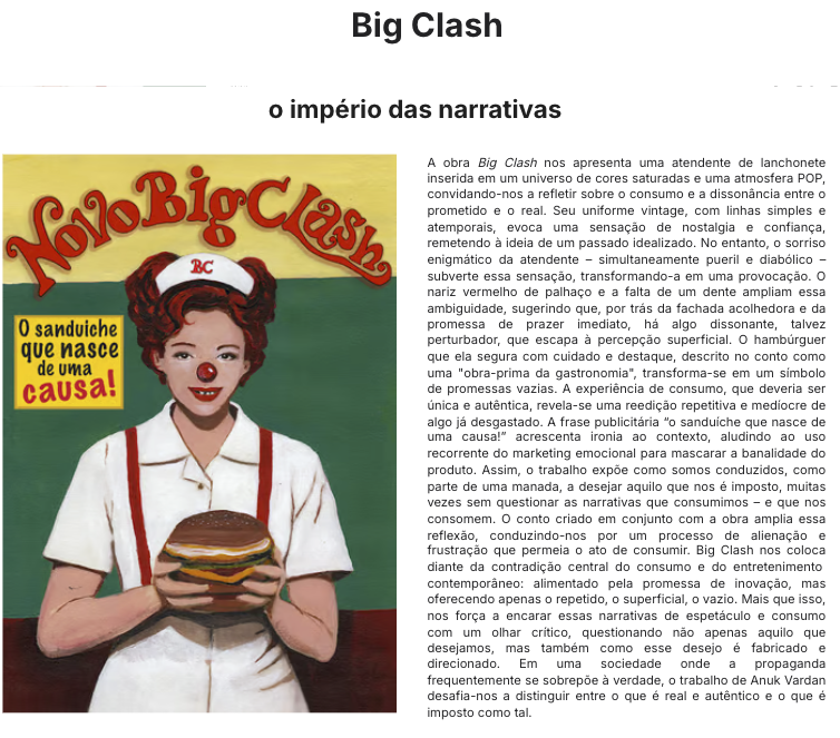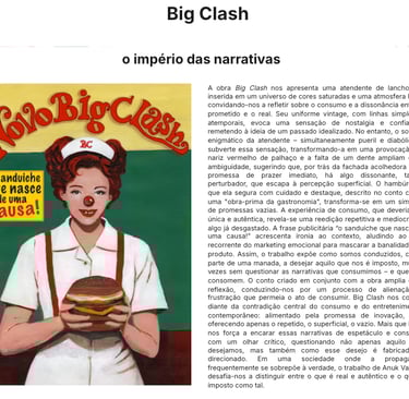 Na ausência deliberada do trabalhador, outrora celebrado por Tarsila, instaura-se, nessa obra de Anouk, uma crítica eloquente: não apenas invisibilizado, ele é substituído por rótulos e objetos de consumo, enquanto a identidade comum ligada ao trabalho se dissolve. Nesse espetáculo, porém, as categorias “esquerda” e “direita” têm mostrado progressivo desgaste. Esvaziadas de conteúdo e de projeto, funcionam hoje menos como linhas de pensamento e mais como rótulos identitários alimentados por sua própria espetacularização, uma lógica que mobiliza e distrai a população das questões centrais de seu interesse.
