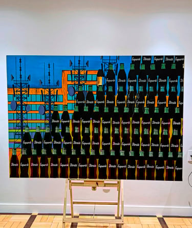 acima, Coca-colonização óleo sobre canvas, 150 cm x 180 cm (chassis Trident)
